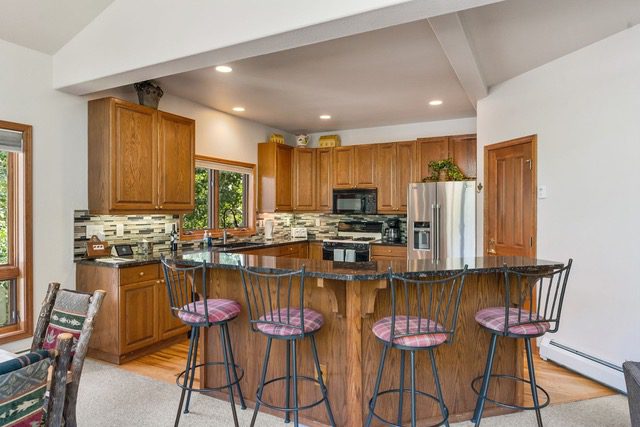 One of our largest units, there is plenty of room for the family to spread out with a very big main living area/great room. The dining table sits ten (10) comfortably. In the front hall, there is a large storage rack to house all your gloves, helmets, hand warmers, and anything else you brought out with you to the mountain.